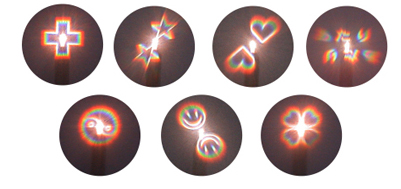 - 透明部分を通して光(点光源)を覗くと、模様や文字が浮かび上がって見える不思議な商品です。
